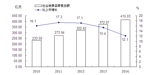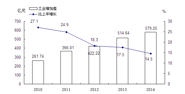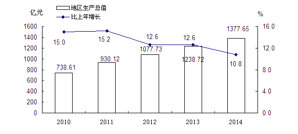 图1 2010-2014年地区生产总值(GDP)及其增长速度就业继续增加。全年城镇新增就业3.25万人,完成年预期目标任务116%;新增农村劳动力转移就业4.19万人,完成年任务105%。全年有1.09万城镇失业人员实现了再就业,完成年预期目标任务106%。年末城镇登记失业率1.58%,比省控制目标低2.42个百分点。