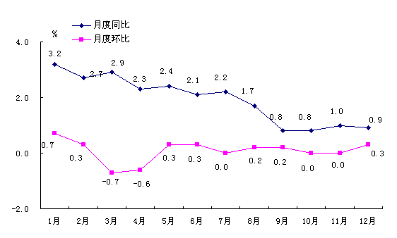 价格总体稳定。居民消费价格一季度同比上涨2.9%,上半年上涨2.6%,前三季度上涨2.3%,全年比上年上涨1.9%,其中食品价格上涨2.1%。工业生产者出厂价格下降1.0%,农产品生产价格上涨0.5%。