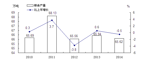 图4 2010-2014年粮食产量及其增长速度表3 2014年主要农产品产量及其增长速度