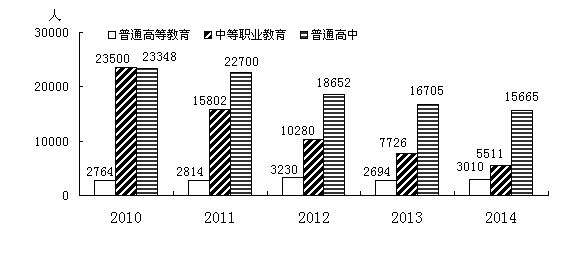 图11 2010-2014年各类学校招生人数全市拥有省级创新型企业27家,创新型试点企业50家,国家高新技术企业26家,省科技型企业222家,知识产权试点企业和优势企业101 家。新增高新技术企业12家、省级企业技术中心5家。2名专家入选国家第十批“千人计划”;1人入选中组部“万人计划”;1人入选科技部“科技创新创业人才”。全市专利授权1168件,比上年下降9.7%。其中发明专利授权102件,比上年增长25.9%。