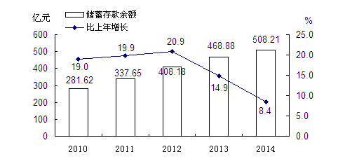 图10 2010-2014年城乡居民人民币储蓄存款余额及其增长速度